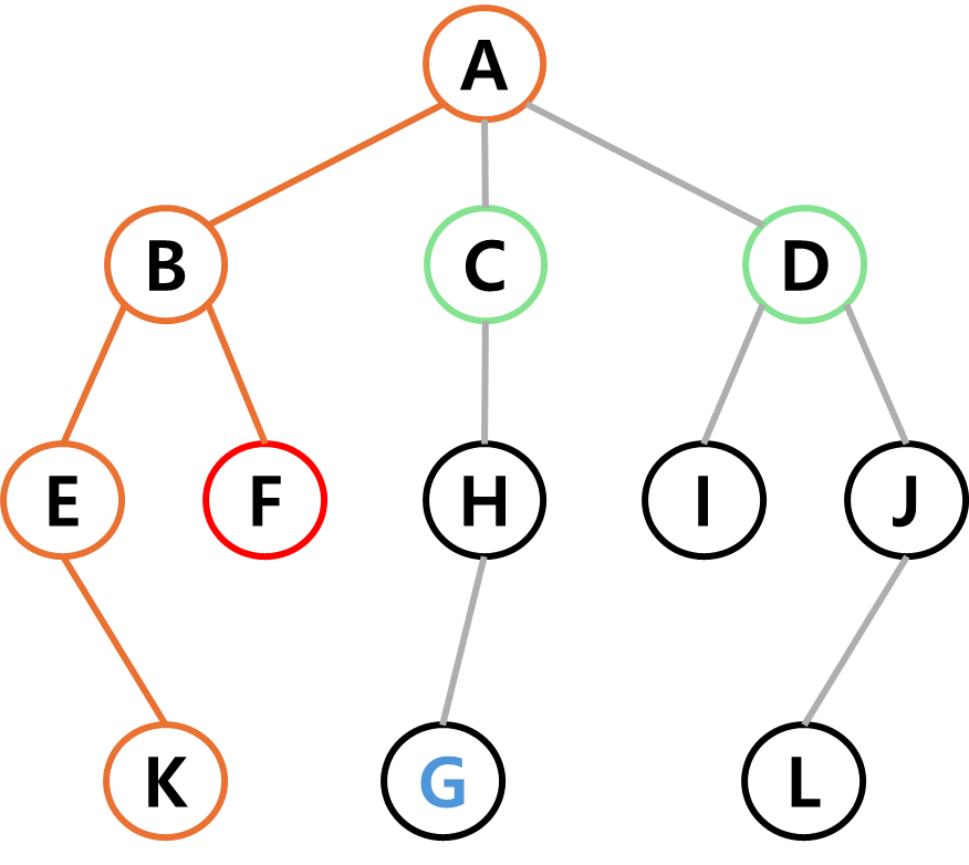 A에서 도달할 수 있는 정점 B, C, D가 다음 진행할 정점 후보가 된다.