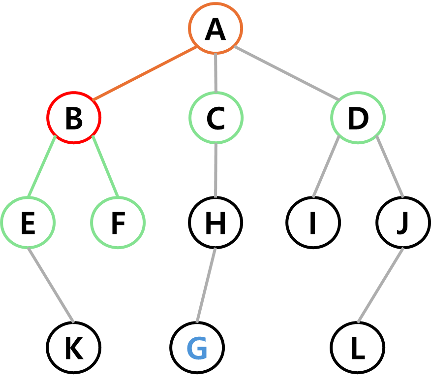 B, C, D가 같은 시점에 후보가 되었기 때문에 가장 왼쪽에 있는 B를 다음 정점으로 선택하겠다.