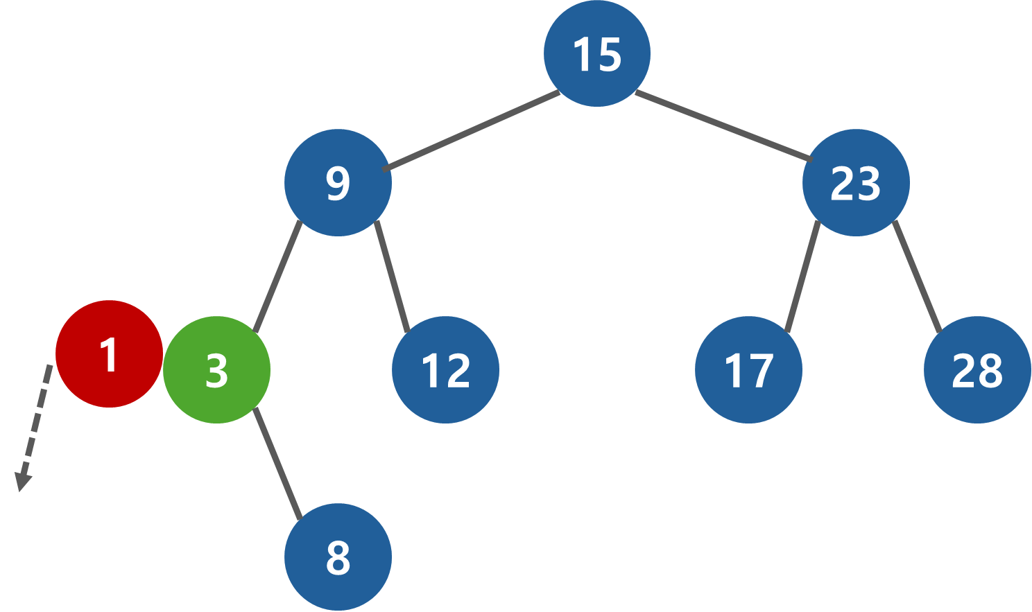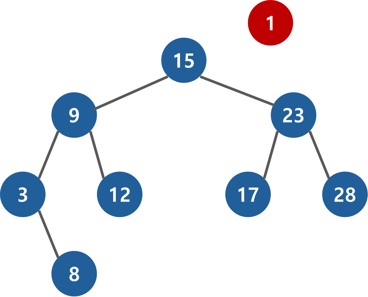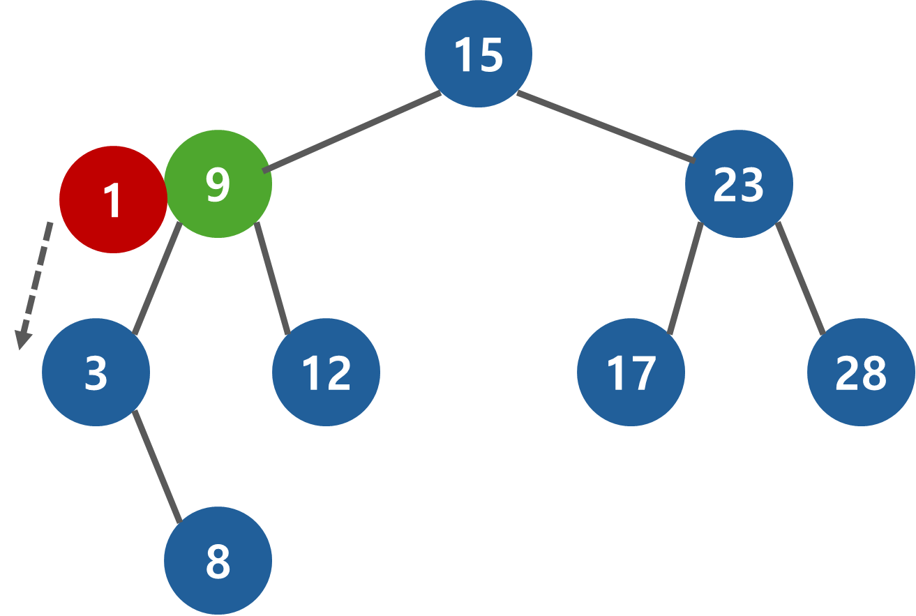 이진 탐색 트리의 최상위 노드(root)에서 부터 추가할 위치를 찾기 시작한다. 추가하려는 값 1과 현재 노드의 값을 비교해서 작으면 왼쪽으로, 크면 오른쪽으로 진행한다. 1 < 15 이기 때문에 왼쪽으로 이동한다