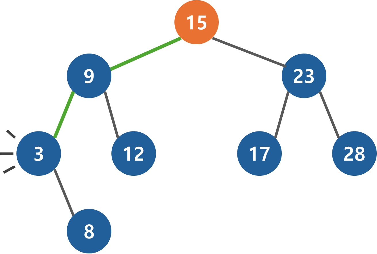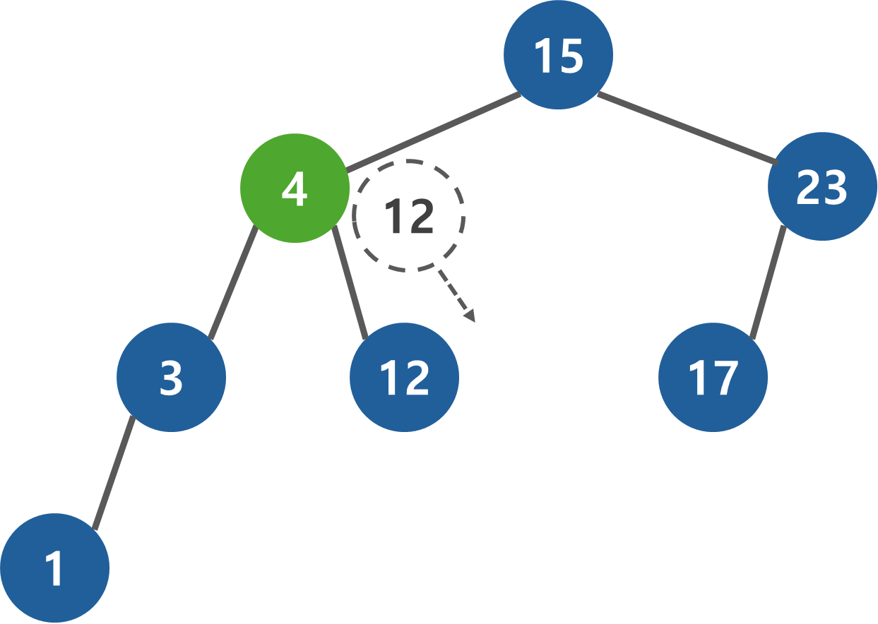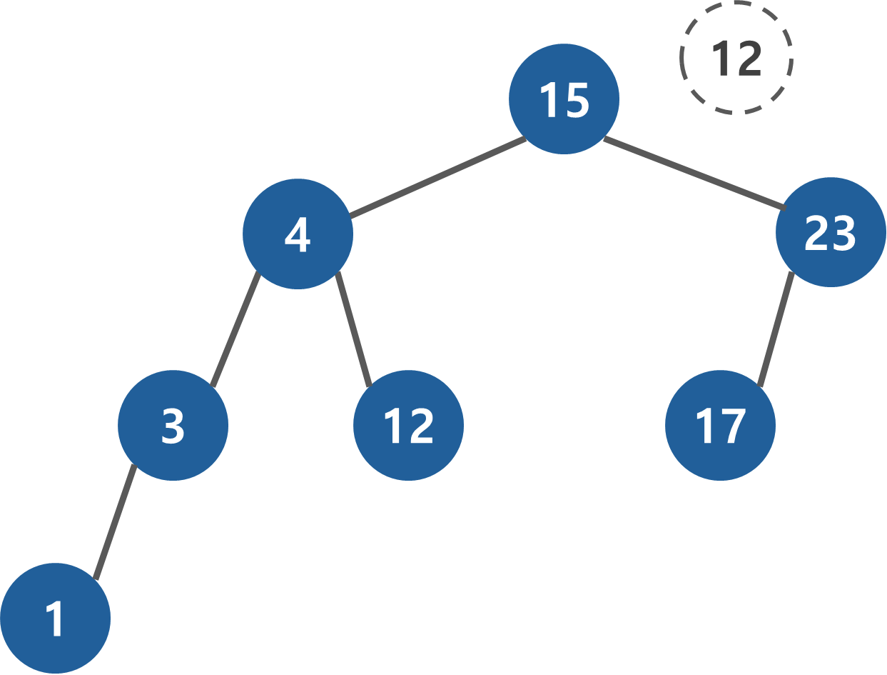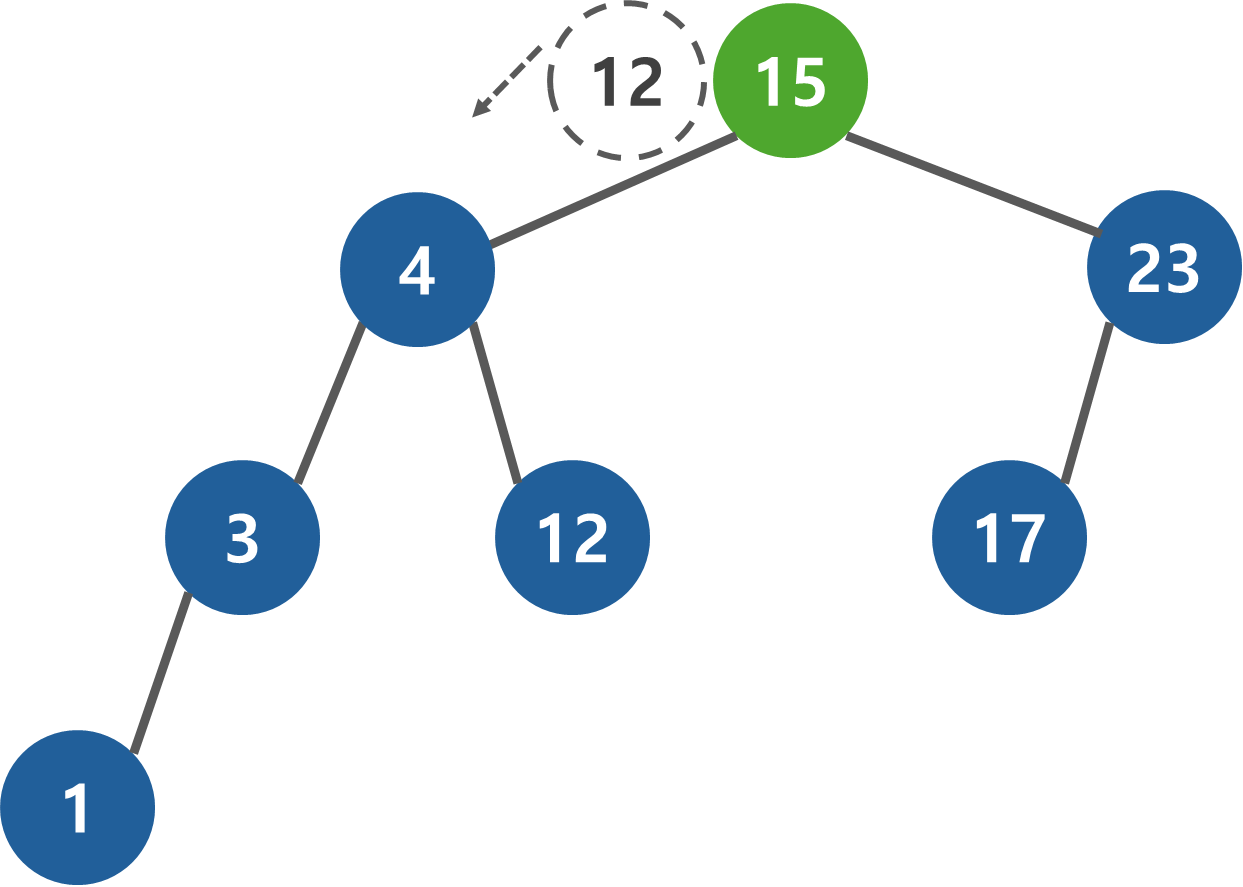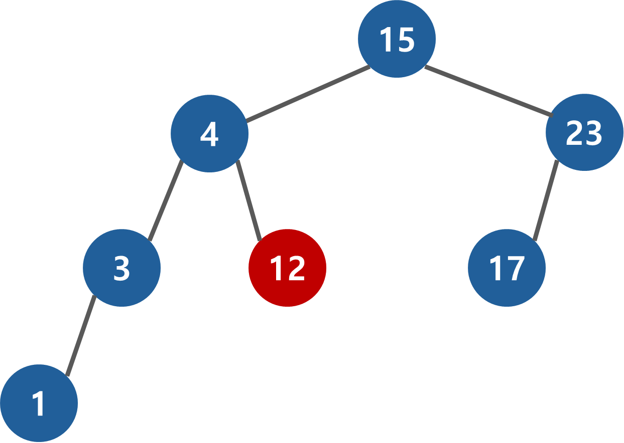 항상 root 노드부터 찾기 시작한다. 추가할 때와 마찬가지로 찾고자하는 데이터와 현재 노드를 비교하여 작으면 왼쪽, 크면 오른쪽으로 진행한다. 12 < 15이므로 왼쪽으로 진행한다.