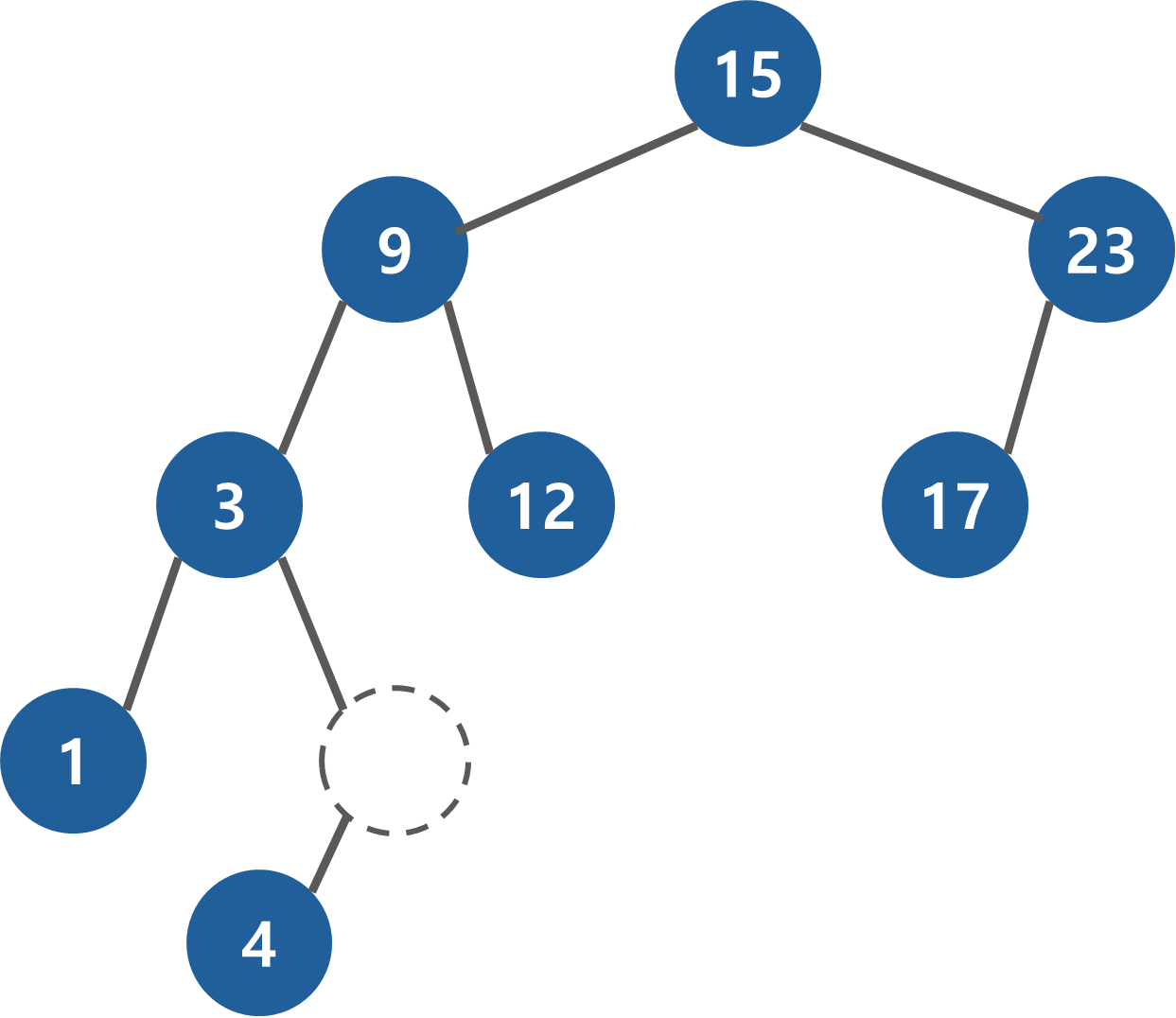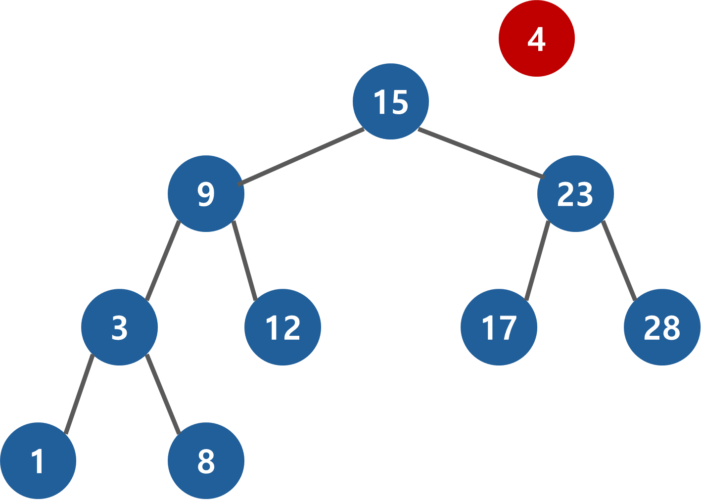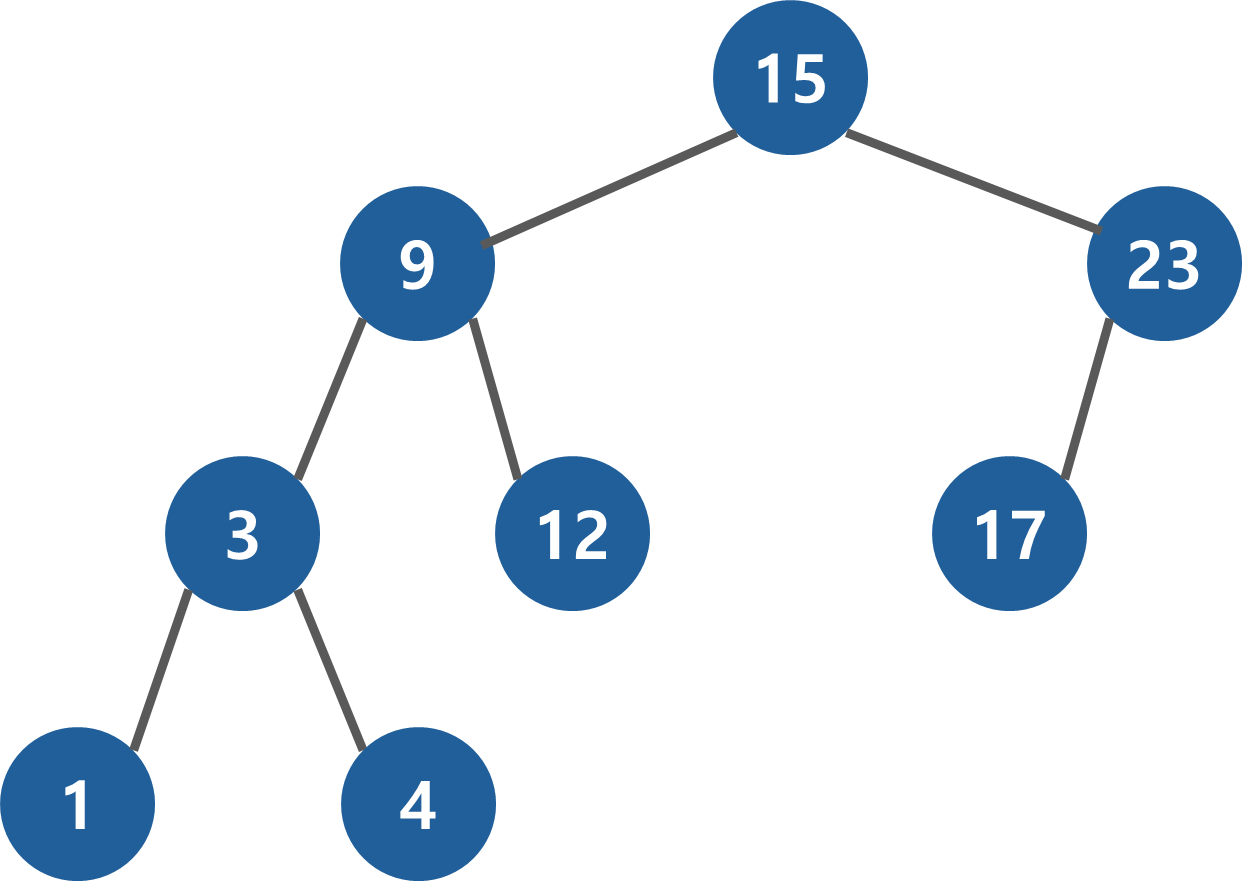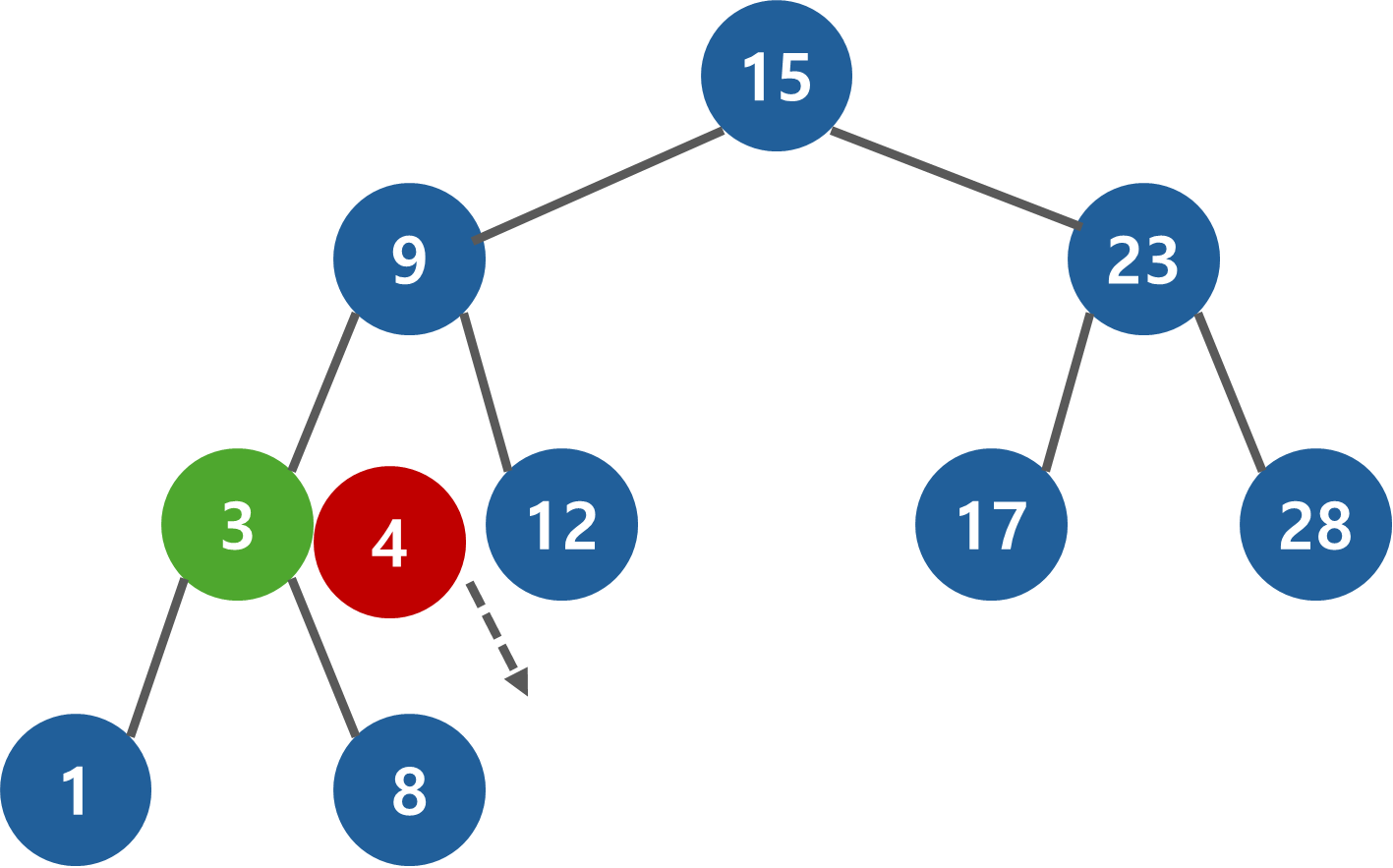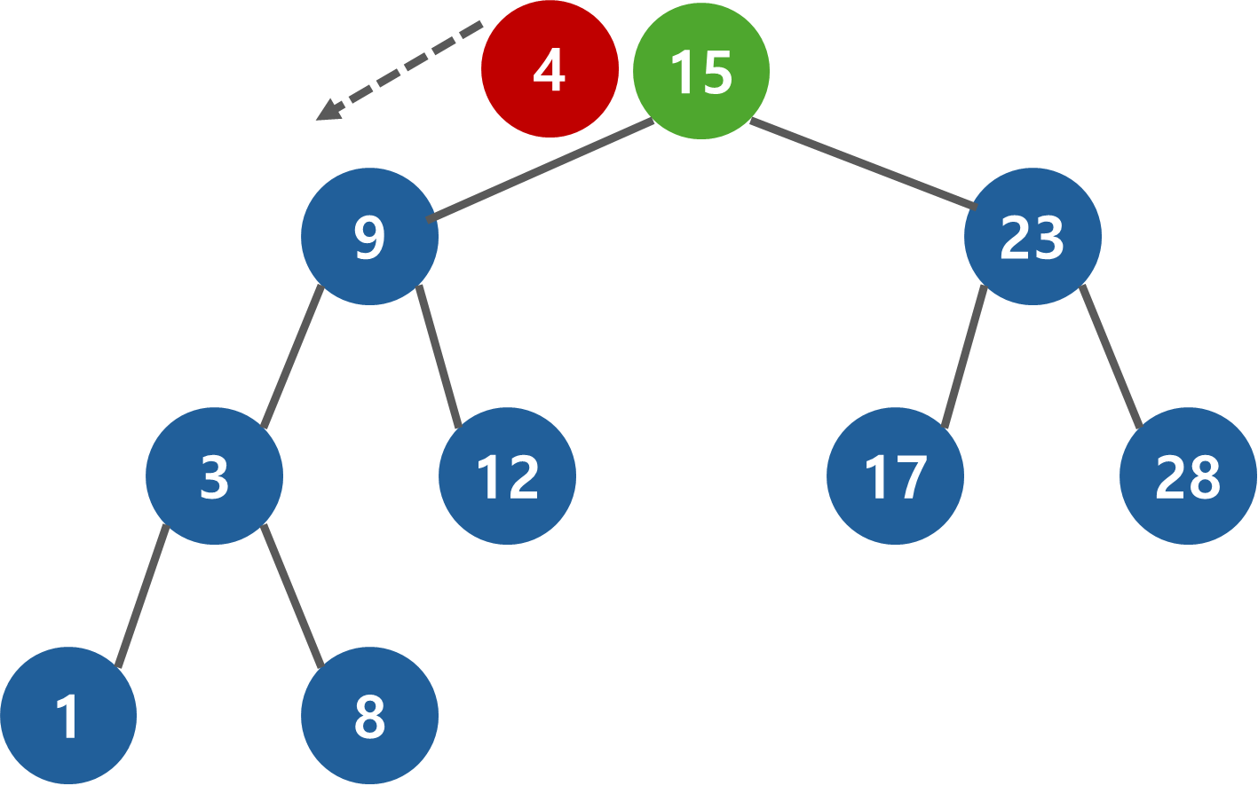 4 < 15 이기 때문에 왼쪽으로 진행한다.