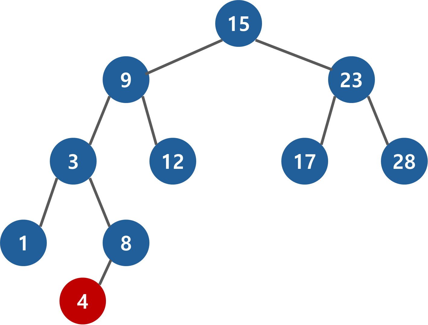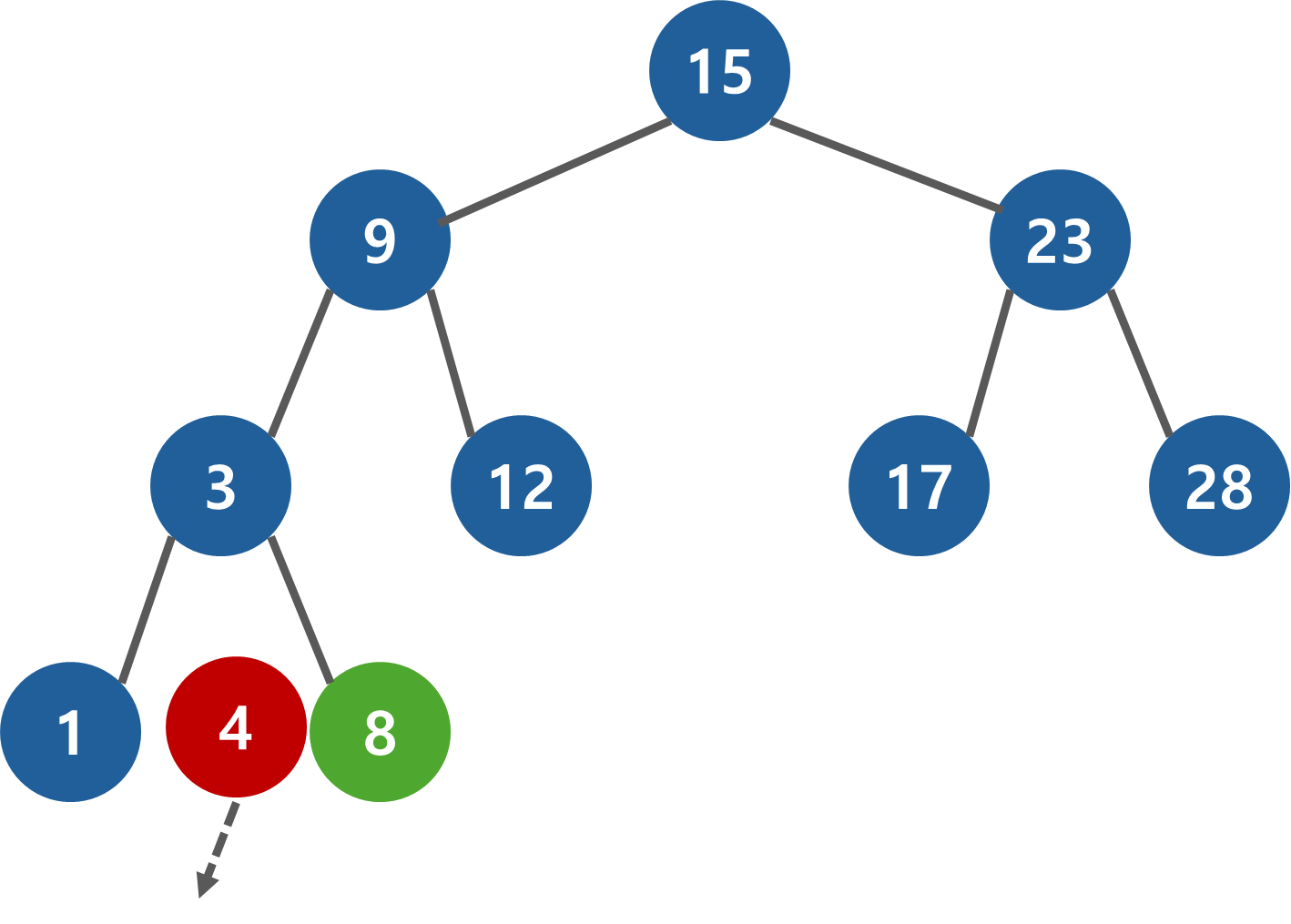 마지막으로 4 < 8 이기 때문에 왼쪽으로 진행하는데, 노드가 없기 때문에 새로운 노드를 추가한다.