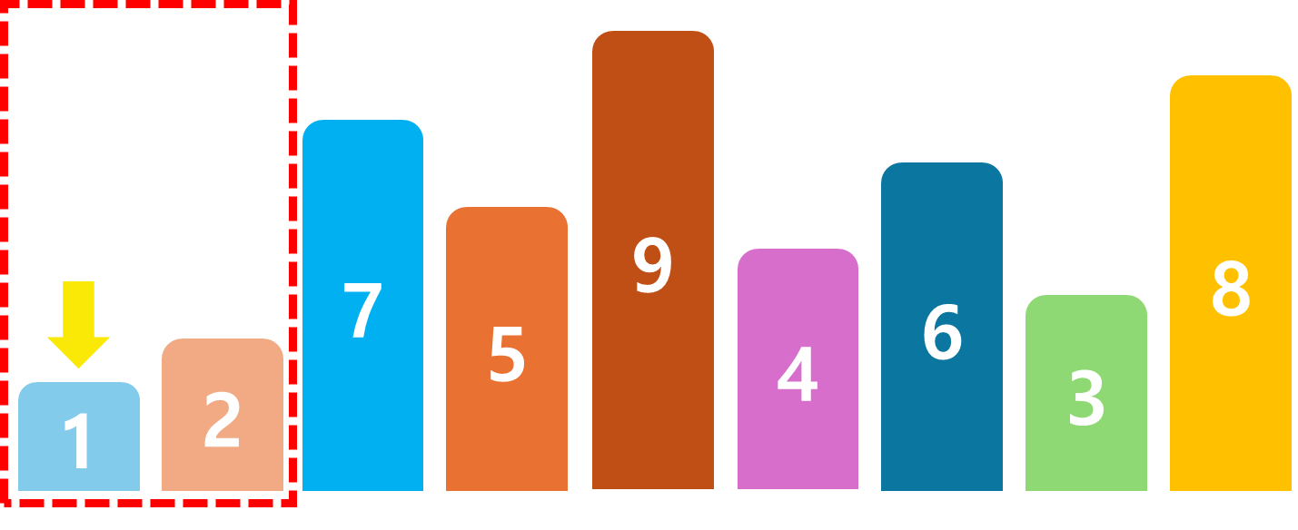 이런식으로 한칸씩 옮기다 보면 가장 작은 숫자인 1이 가장 왼쪽으로 정렬이 된다. 이렇게 가장 오른쪽부터 왼쪽까지 오면 1라운드가 끝났다.