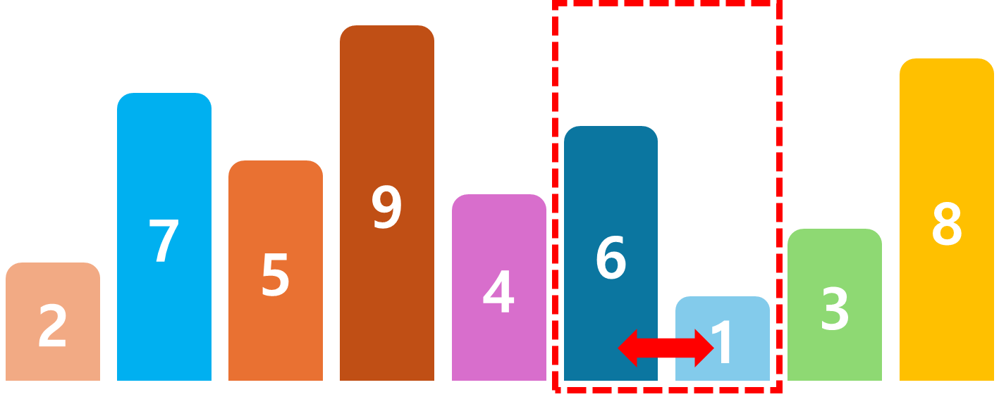 다음 한칸 옮겨 두 수를 비교하면 6 > 1 이기 때문에 변경해 준다.