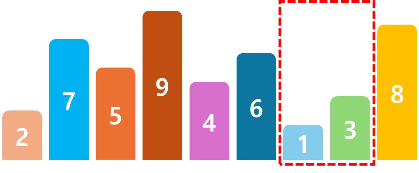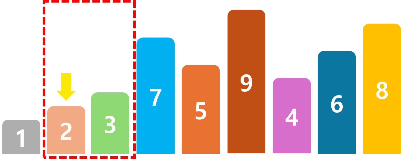 비교를 완료하면 한칸 옮겨 같은 방법으로 숫자를 비교한다. 이번엔 1 > 3 이기 때문에 변경하지 않는다.