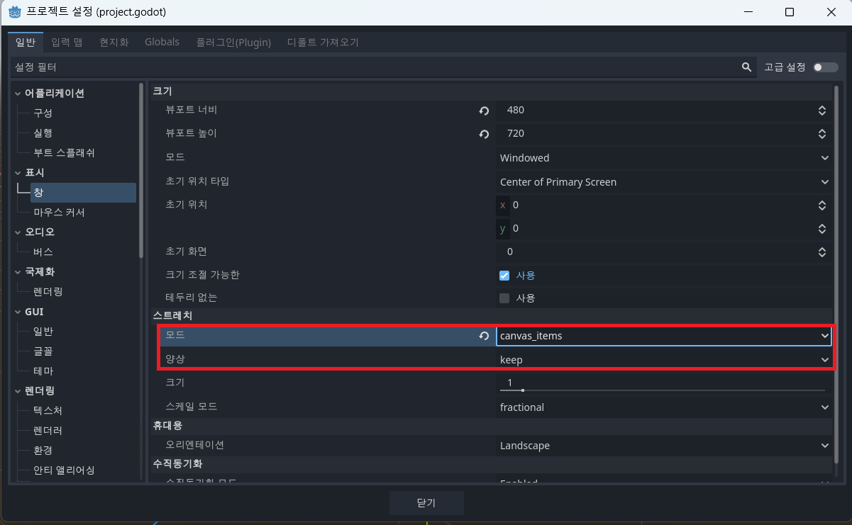 다음은 아래 '스크래치' 에서 모드를 canvas_item, 양상은 keep으로 설정하고 닫기를 눌러주면 된다.