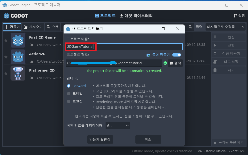 프로젝트 이름을 설정해주고 '만들기 & 편집' 버튼을 눌러주면 프로젝트가 생성 된다.