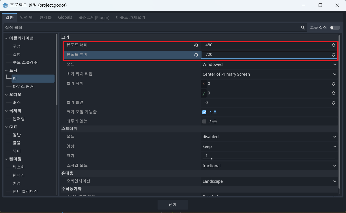 여기서 좌측 메뉴에 '표시' 아래 '창'을 눌러주고 뷰포트 너비를 480, 뷰포트 높이를 720으로 설정해 준다.