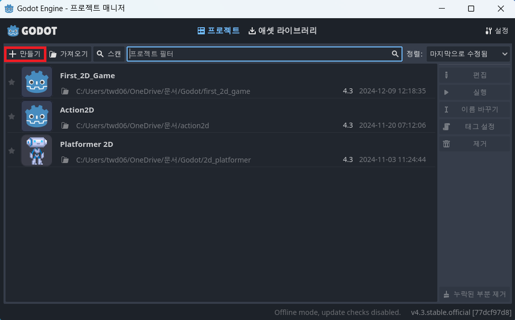 프로젝트 매니저가 실행되는데 여기서 만들기 버튼을 눌러준다.