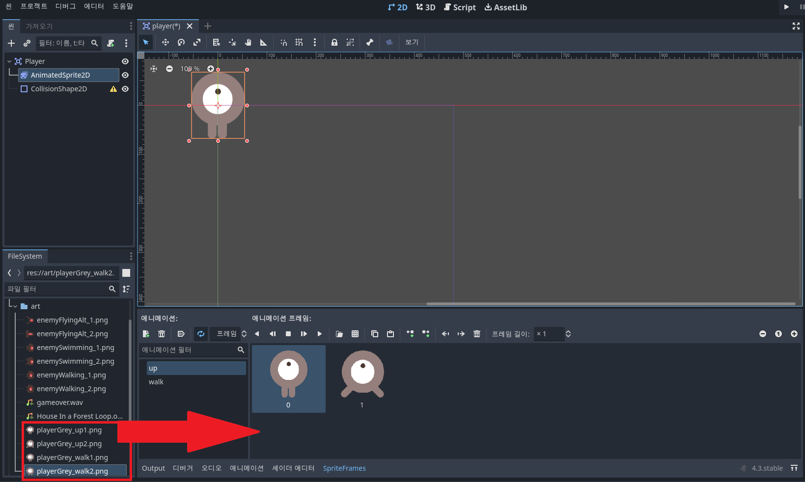 다음은 오른쪽 구석 FileSystem 메뉴에서 art폴더를 찾아 열어서 player 이미지에 맞게 넣어주면 된다.