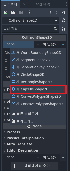CollisionShape2D노드를 열어 인스펙터 메뉴에서 'Shape'에서 'CapsulShape2D'를 선택해준다. CapsulShape2D는 충돌 범위를 타원형으로 설정할 수 있게 한다.