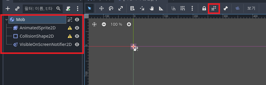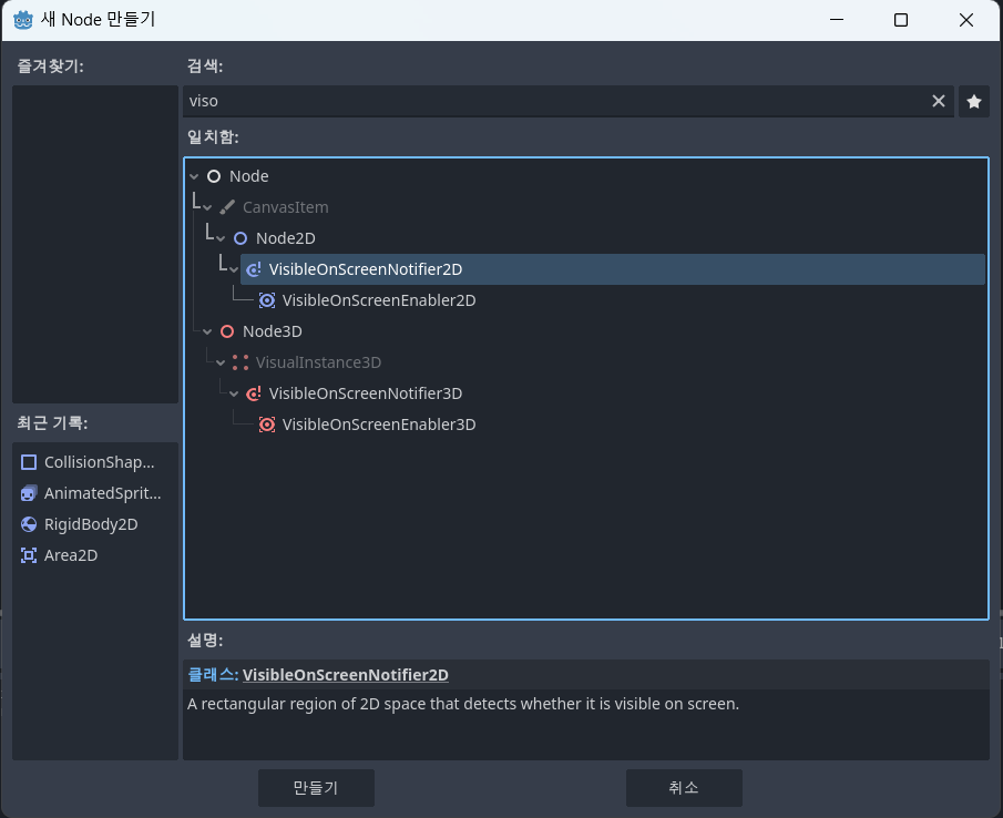 마지막으로 'VisibleOnScreenNotifier2D' 노드까지 추가해준다.