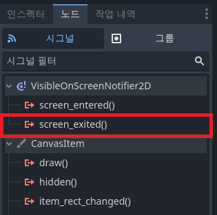 먼저 'VisibleOnScreenNotifier2D' 노드를 클릭해 주고 노드 메뉴에서 'screen_exited()'를 연결해 준다.