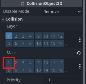 그리고 아래 Collision Object2D 안에 Collision영역을 열어 Mask 속성 내부의 1을 눌러 취소해 준다. 그러면몹들 간의 충돌을 방지해준다.