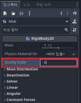 먼저 'Mob' 노드에서 인스펙터 메뉴에 Gravity Scale을 '0'으로 변경해 준다. Gravity Scale은 중력에 관한 설정으로 0으로 해주면 몹들이 바닥으로 추락하는 것을 방지해준다.