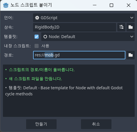 루트 노드는 'RigidBody2D'로 생성해주고 이름은 'Mob'으로 변경해준다.