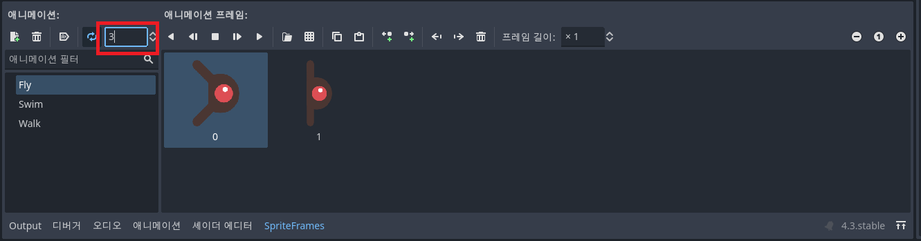애니메이션의 속도 설정은 각각 해줘야 함으로 3개의 애니메이션 모두 프레임을 3으로 맞춰준다.