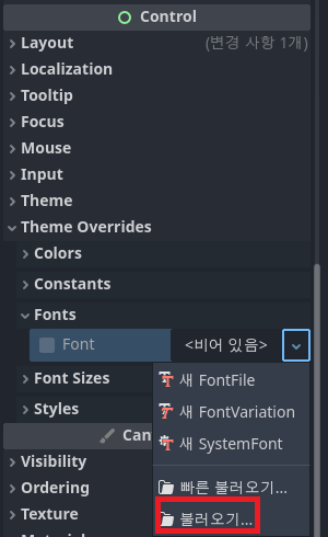 인스펙터 메뉴에 Control 영역에서 Theme Overrides > Fonts 를 열어 폰트를 불러온다.