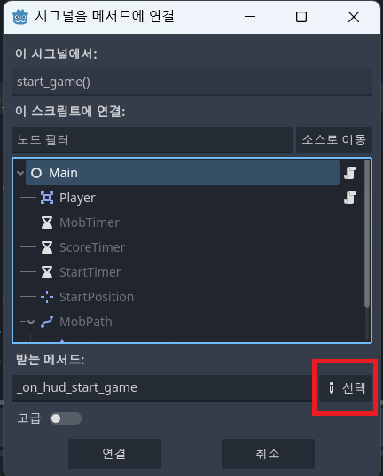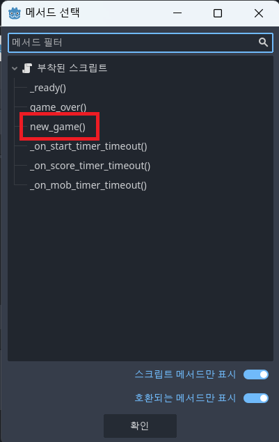 메인 노드를 클릭하고 선택 버튼을 누르면 메서드를 선택할 수 있는 창이 나오는데 'new_game()' 함수와 연결해준다.