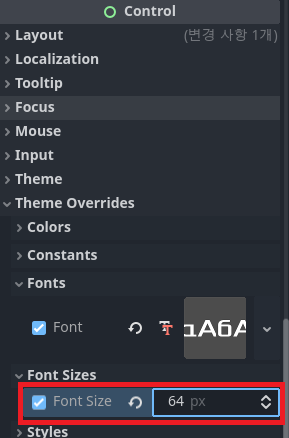 글자 크기가 여전히 작기 때문에 Theme Overrides > Fonts Size에서 글자 크기를 64px로 변경해준다.