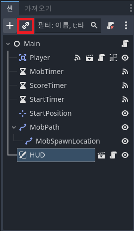 Main씬으로 넘어가 저번 Main씬을 만들때 Player씬을 연결해줄때 처럼 체인 버튼을 눌러 HUD씬을 연결해주자.