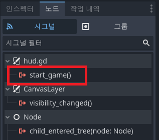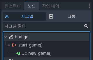 HUD씬 인스턴스 노드를 누르고 노드 메뉴에서 start_game()을 더블 클릭하면 위의 사진과 같은 창이 나온다.