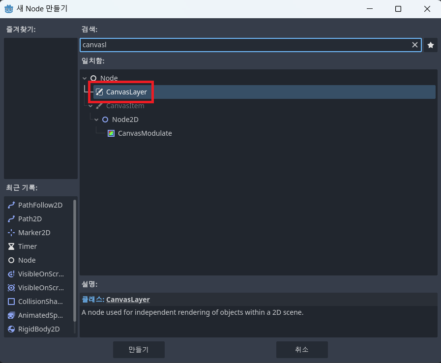 - CanvasLayer: 2D 작업 내에서 객체를 독립적으로 랜더링 하는 데 사용되는 노드, 해당 노드에 표시되는 정보가 플레이어나 몹에 가려지지 않음