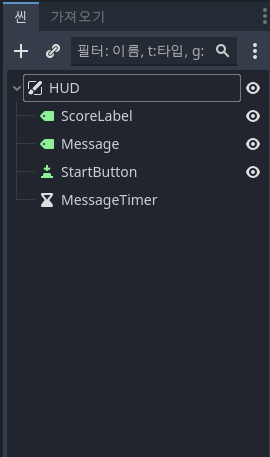HUD의 루트노드는 'CanvasLayer'노드 이다. 생성 후 이름을 'HUD'로 변경해 주자.