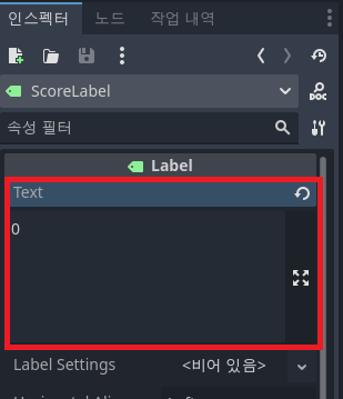 'ScoreLabel'을 클릭한 후 인스펙터 메뉴에서 Text에 '0'을 입력해 준다.