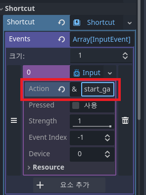 InputEventAction을 추가해주고 해당 이벤트를 열어서 Action에 'start_game'을 넣어준다.